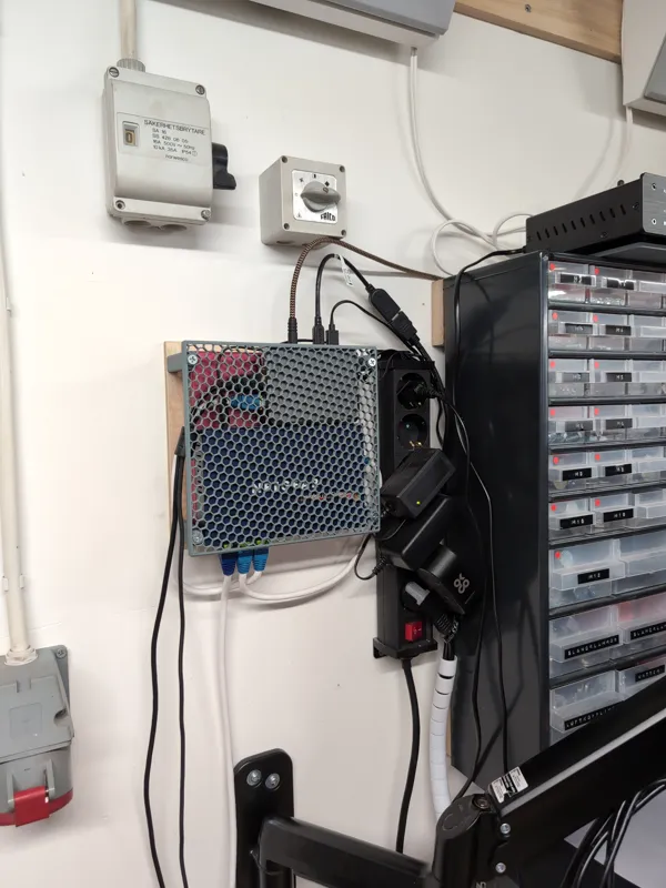 I bought a cheap wardrobe that would fit my Mars 3 and UW-01 wash/cure machine side by side to use as a resin printing station, and will house all printing tools and accessories. Originally the plan was to build a custom cabinet, but the price for just the MDF exceeded the cost of this complete wardrobe. I've added casters to be able to easily move it around as necessary; two with locks at the front and two without at the rear. All four casters swivel. It would probably be better if the rear casters were fixed, but these were what I had laying around. To keep dust out, and allow pre-heating when the temperature drops, I've added sealing strips around the front. On the inside I've fitted an IKEA Skådis board on the door, a dual electrical outlet, and a holder for the power adapters.